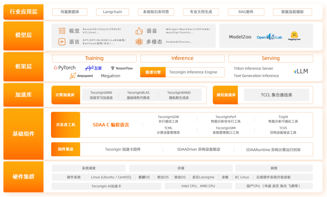 太初異構(gòu)并行計算平臺以太初人工智能系列硬件為基礎(chǔ),基礎(chǔ)組件層完成對硬件驅(qū)動及操作系統(tǒng)的高度抽象,并提供完整的運行時庫,編程模型及配套的編譯、調(diào)試和分析工具;加速庫提供包括太初DNN、太初BLAS等基礎(chǔ)且豐富的算子庫;應(yīng)用層整合了當(dāng)前主流的深度學(xué)習(xí)框架。