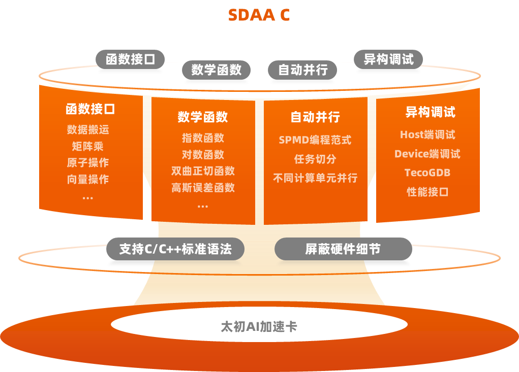 SDAA C運行于基礎(chǔ)組件層,對下屏蔽了硬件的物理特性,對上提供了豐富的編程接口,以及代碼調(diào)試、調(diào)優(yōu)工具。無需感知底層的硬件細(xì)節(jié),僅需遵從SDAA C的規(guī)范即可使用太初AI加速卡,為高并發(fā)、大數(shù)據(jù)運算提供強(qiáng)有力的算力支撐。