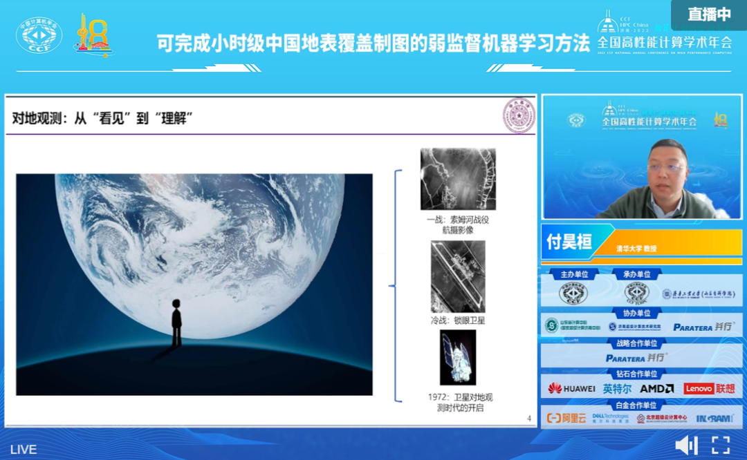 清華大學地球系統(tǒng)科學系長聘教授,國家超級計算無錫中心副主任付昊桓在主題講演中基于對新一代神威超級計算機的應用,討論了有關地表覆蓋制圖的一種高可擴展的弱監(jiān)督分類方法,無需額外的人工標注,即可完成大尺度的地表覆蓋任務。