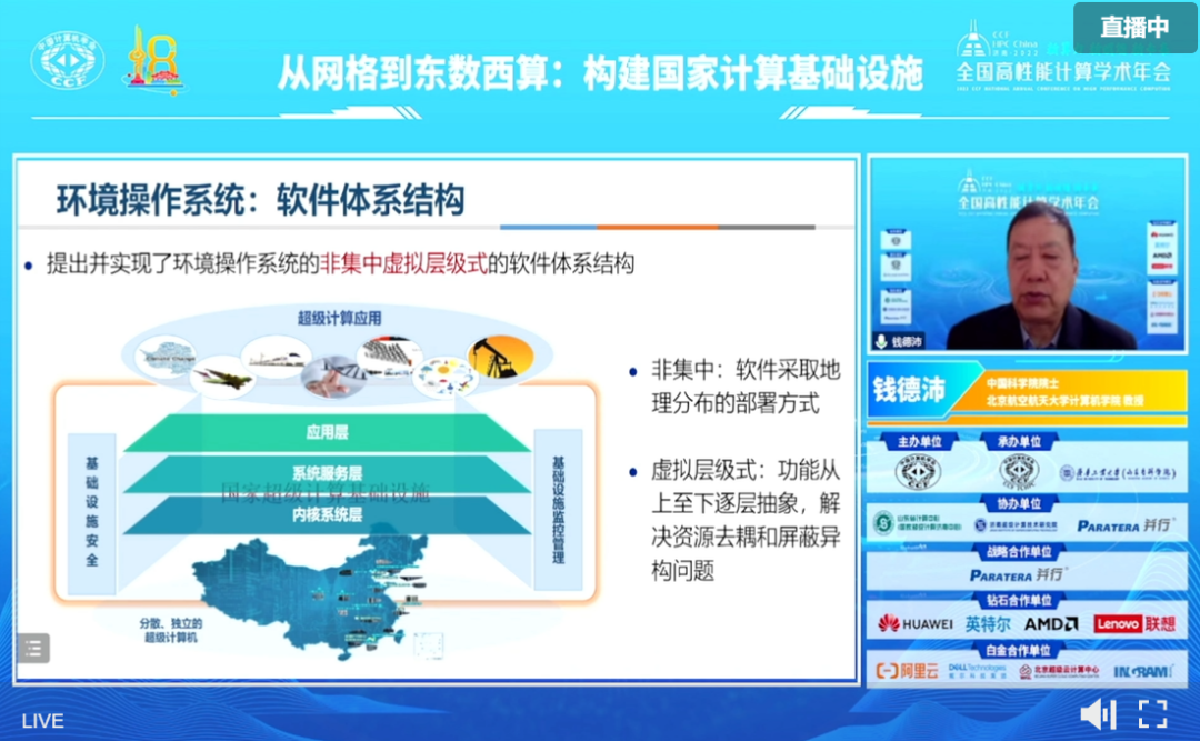 中國科學院院士、北京航空航天大學計算機學院教授、中國計算機學會會士錢德沛在主題演講中,著重介紹了國家高性能計算環(huán)境的實踐,總結(jié)了國家20多年來在高性能計算的超常發(fā)展,談到“超算應該進一步提升其基礎設施形態(tài)?!?/span>